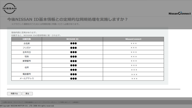 NISSAN IDとNissanConnect 会員IDに登録されている情報に違いがあった場合に表示されます。このまま「同意する」を押すと、NISSAN IDに登録されている情報がNissanConnect 会員 IDにも反映されます。