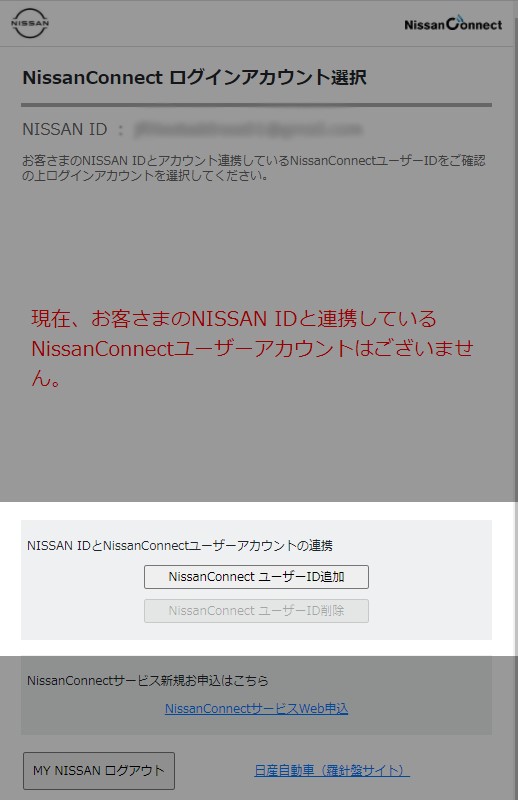 「NissanConnect ログインアカウント選択」画面で、「NissanConnectユーザーID追加」をクリックしてください。