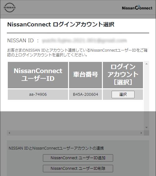 NissanConnectログインアカウント選択画面で、NissanConnectメンバーサイトにログインをするアカウントを選択すると、当該アカウントでログインします。